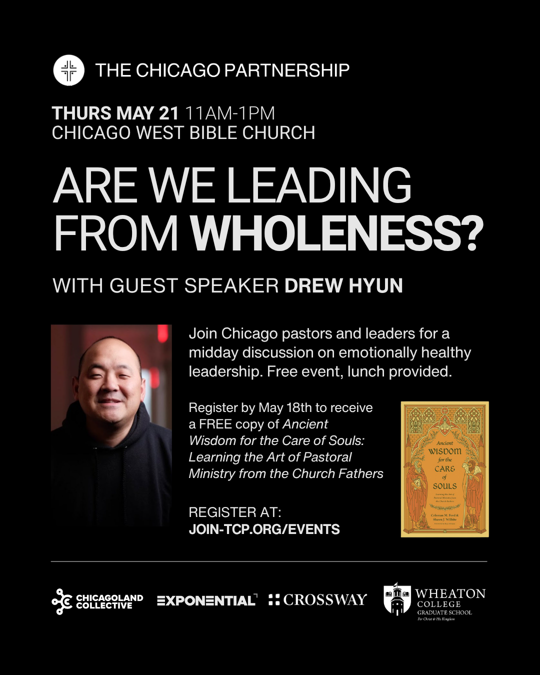 Join Chicago pastors and ministry leaders on Thursday, May 21 from 11am–1pm at Chicago West Bible Church for a midday conversation on emotionally healthy leadership with guest speaker Drew Hyun. Together, we will explore what it means to lead from wholeness while navigating the real pressures of ministry. This free gathering includes lunch and space for meaningful connection with other leaders serving across the city.