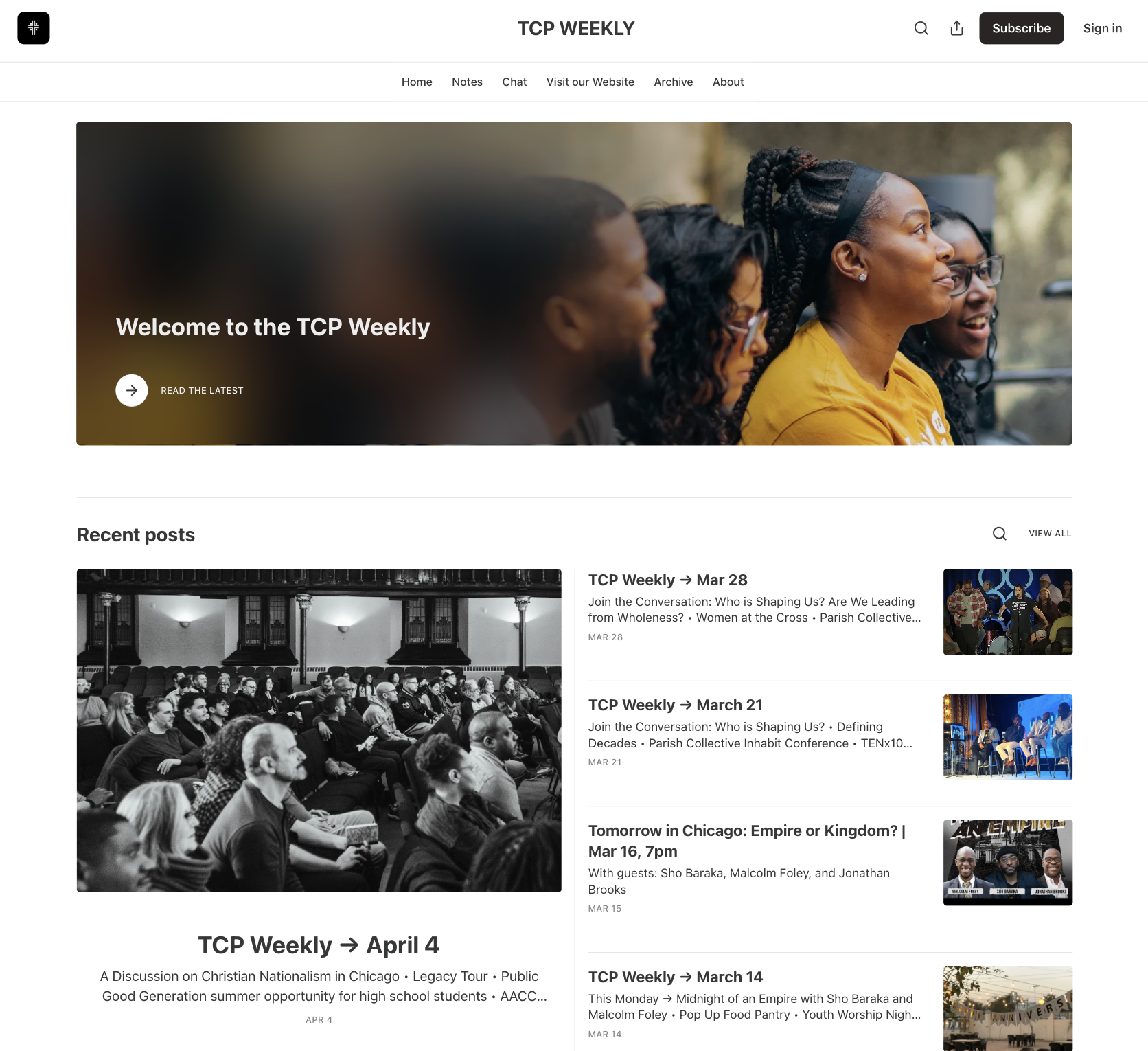 The TCP Weekly is a weekly Substack publication of The Chicago Partnership, reaching more than 3,000 pastors, church leaders, and ministry practitioners across Chicago each week.